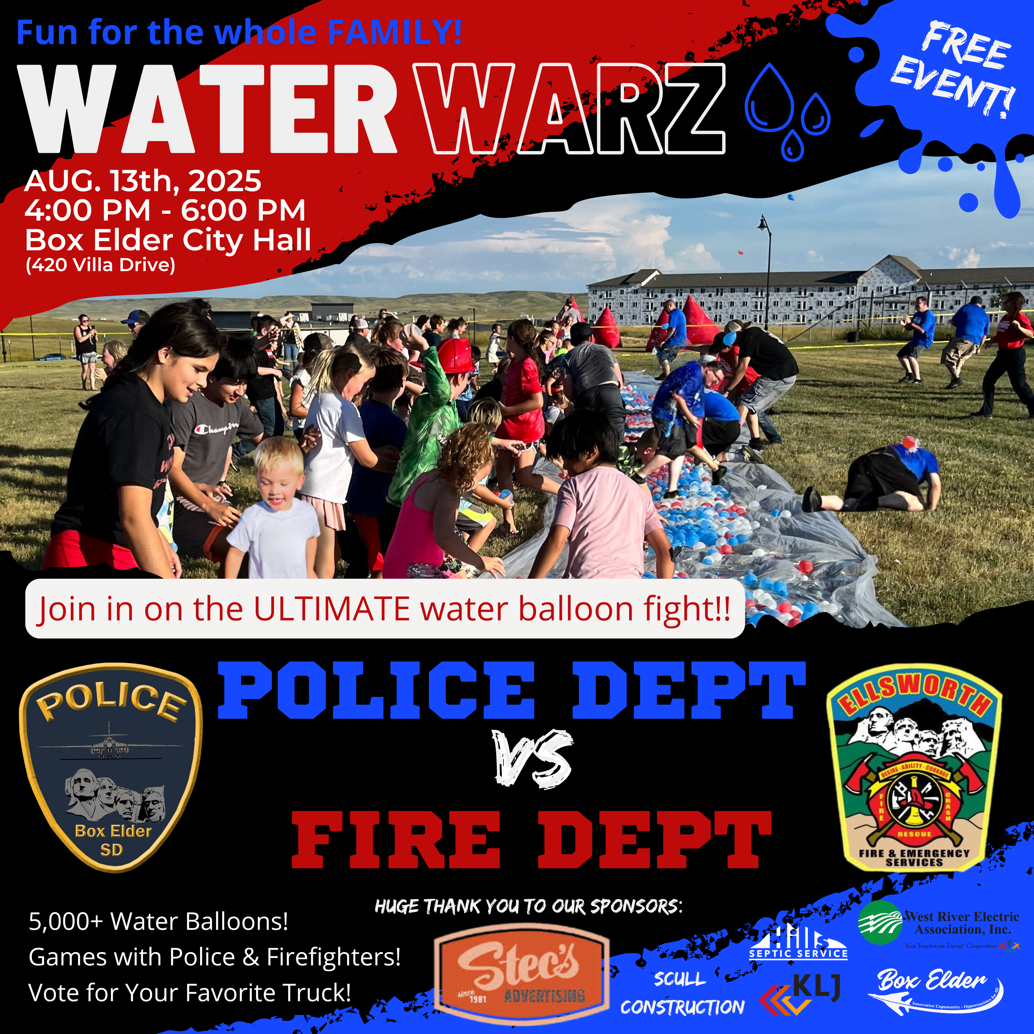 Get ready for the ultimate splash showdown! Kids pick your side - it's Box Elder Police Dept vs. Ellsworth Fire Dept in our annual Water Warz Event — and you're not going to want to miss it!